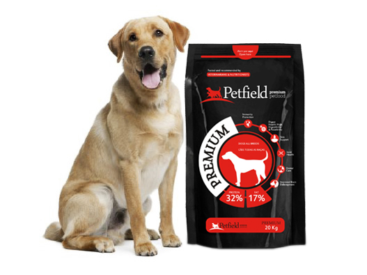 Petfield® PREMIUM é um alimento completo formulado para cães adultos de todas as raças. As proporções correctas de ácidos gordos Ω3 e Ω6 ajudam a manter a saúde da pele e pêlo do seu cão. Com pré-bióticos para a manutenção óptima do sistema gastrointestinal, glucosamina e sulfato de condroitina para a prevenção dos problemas articulares. A dose diária recomendada de alimento deverá ser ajustada de acordo com a condição física do animal e o seu nível de actividade. O seu cão deverá ter sempre água limpa e fresca à disposição.