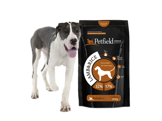 Petfield® LAMB&RICE é um alimento completo formulado para cães adultos de todas as raças. Ideal para animais com um sistema digestivo mais sensível. As proporções correctas de ácidos gordos Ω3 e Ω6 ajudam a manter a saúde da pele e pêlo do seu cão. Com pré-bióticos para a manutenção óptima do sistema gastrointestinal, glucosamina e sulfato de condroitina para a prevenção dos problemas articulares. A dose diária recomendada de alimento deverá ser ajustada de acordo com a condição física do animal e o seu nível de actividade. O seu cão deverá ter sempre água limpa e fresca à disposição.
